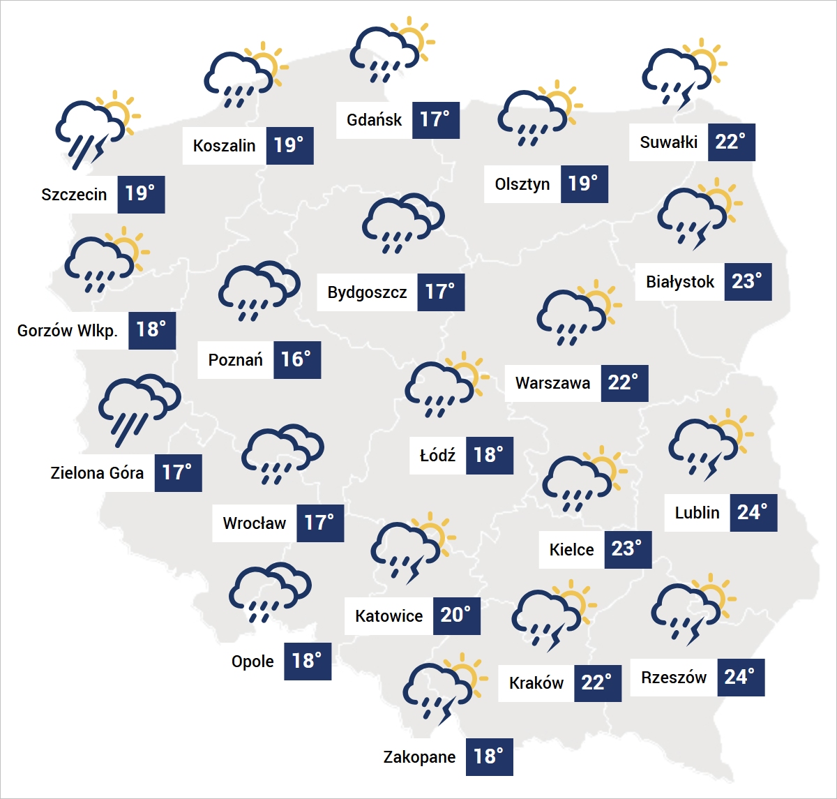 Znów burze mogą występować we wszystkich regionach, ale z nasiloną częstotliwością w pasie od północnego zachodu przez centrum po południe i południowy wschód. Tych najsilniejszych zjawisk spodziewamy się przede wszystkim na południu i południowym wschodzie.