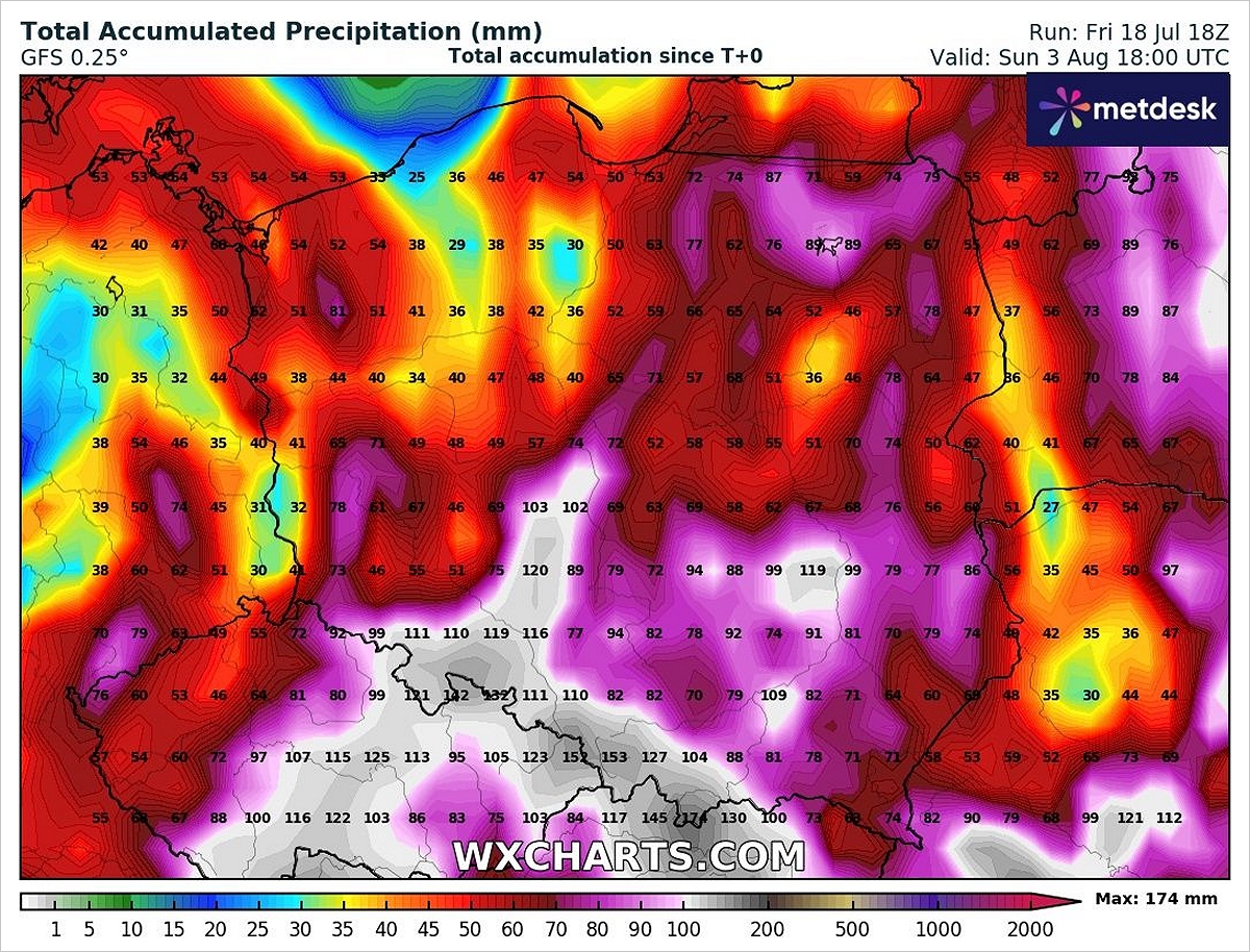 Sumy opadów (mm) prognozowane do 3 sierpnia według modelu GFS. Fot. wxcharts.comWystarczą zaledwie trzy dni nieprzerwanych, ulewnych deszczy, by nawet po długotrwałej suszy spadła taka ilość wody, jaka normalnie pada przez miesiąc lub dłużej. Wtedy rzeki gwałtownie przybierają, a lokalne podtopienia mogą szybko przerodzić się w powódź.