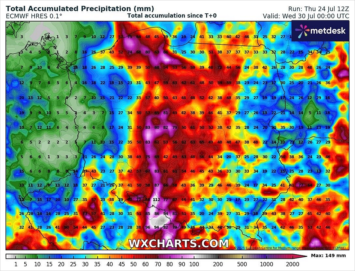 W trakcie ciągłych, wielogodzinnych opadów deszczu, połączonych z burzami, spadnie przeważnie od 50 do 100 mm deszczu, a miejscami powyżej 100 mm, zwłaszcza na terenach górzystych, gdzie za sprawą orografii natężenie opadów będzie zdecydowanie największe i może przekraczać 150 mm.