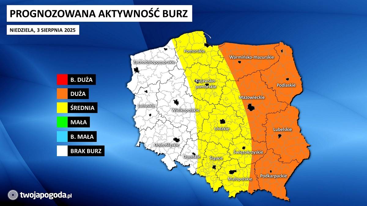 Te najbardziej intensywne burze, również superkomórkowe, przechodzić będą aż do późnych godzin wieczornych, a nawet nocnych, od województwa warmińsko-mazurskie przez podlaskie i mazowieckie po lubelskie i podkarpackie.