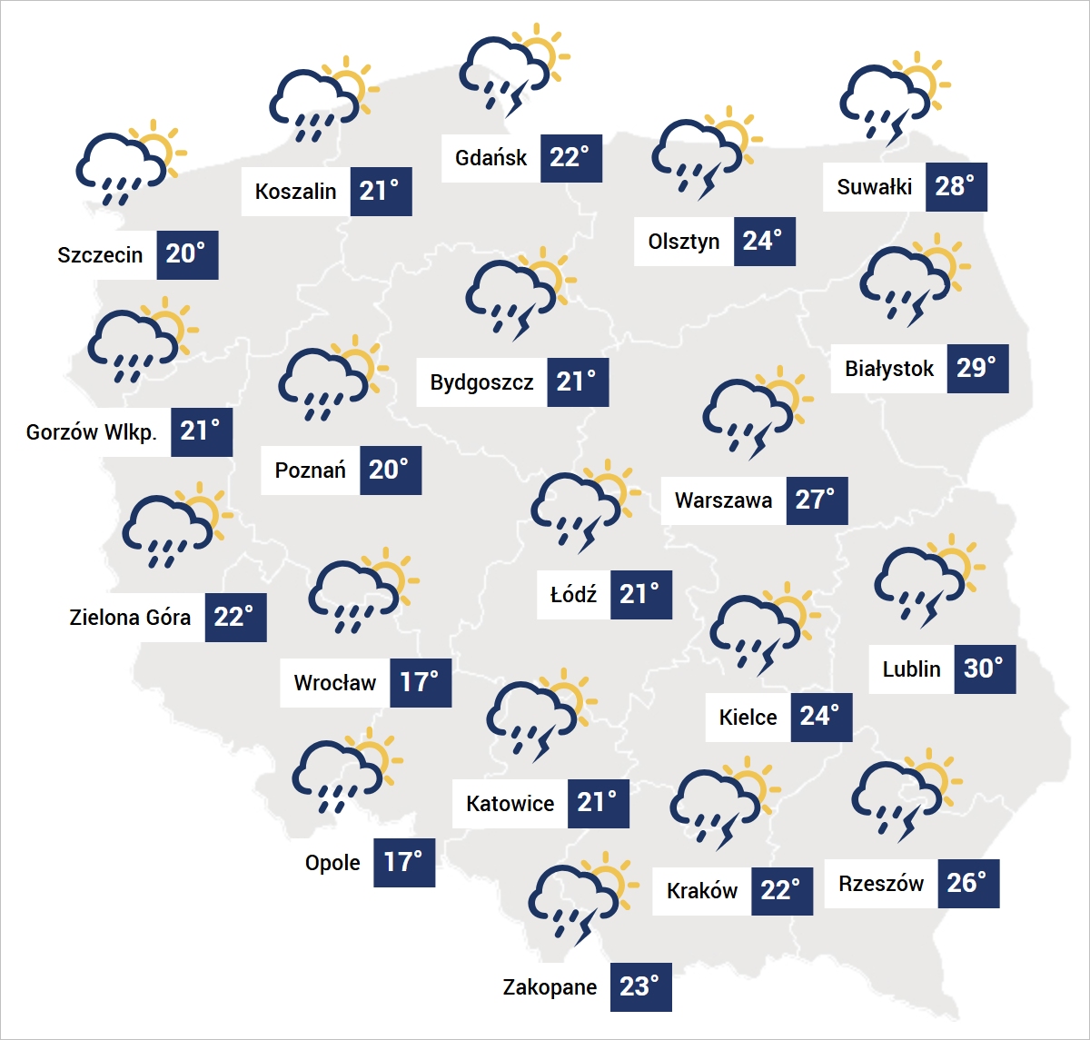Temperatura będzie mocno zróżnicowana, od 17 stopni w Opolu i we Wrocławiu przez 18-21 stopni w zachodniej połowie kraju do 25-29 stopni we wschodniej połowie, a w Lublinie do nawet 30 stopni w cieniu.