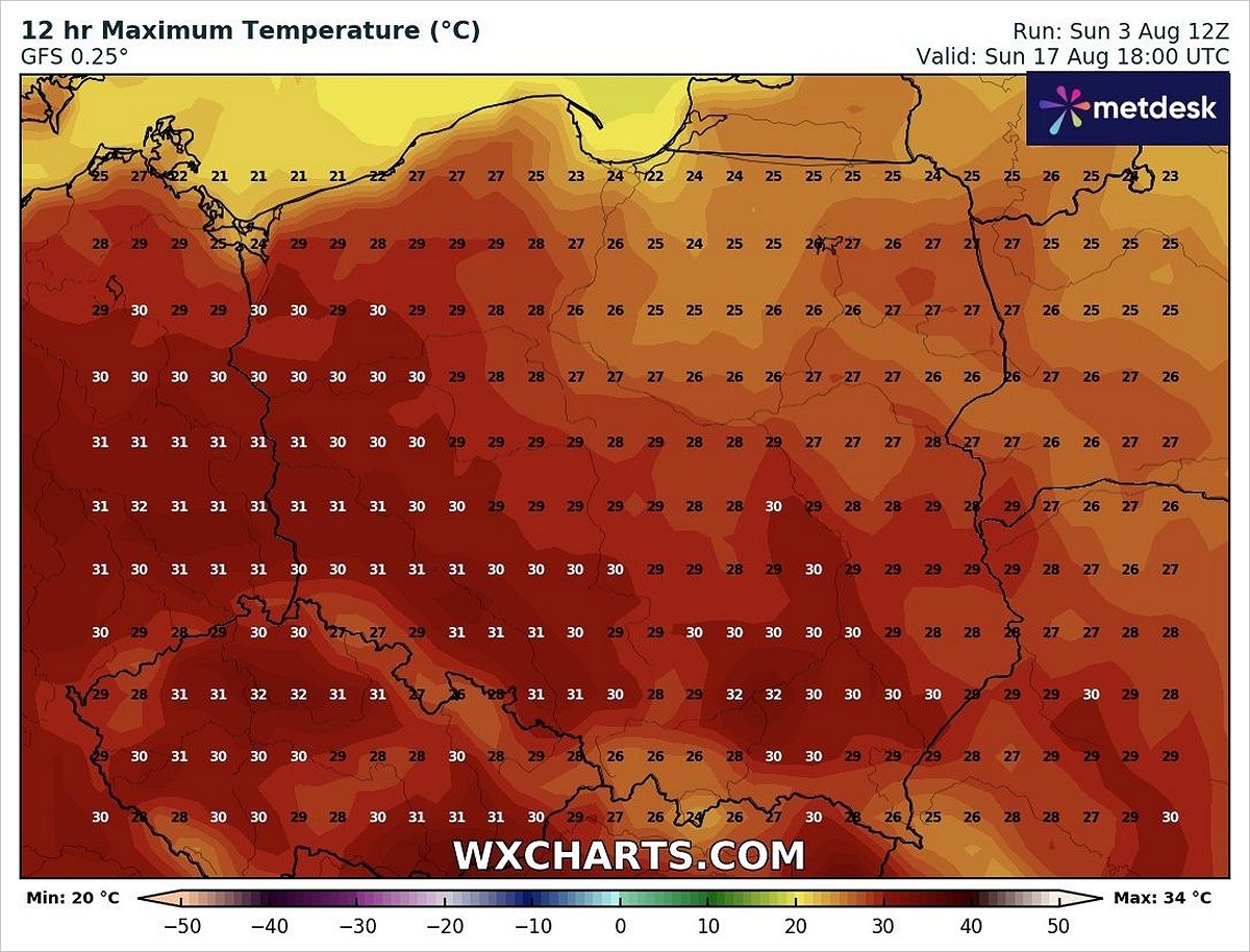 Temperatury prognozowane na 17 sierpnia. Fot. wxcharts.comSobota (16.08) pod znakiem zupełnie wolnego od chmur nieba, które będzie się mienić głębokim błękitem. Jeszcze goręcej, od 26 do 29 stopni, a na zachodzie, południu i w centrum do 30-31 stopni. Jedynie nad samym morzem chłodniej, poniżej 25 stopni.