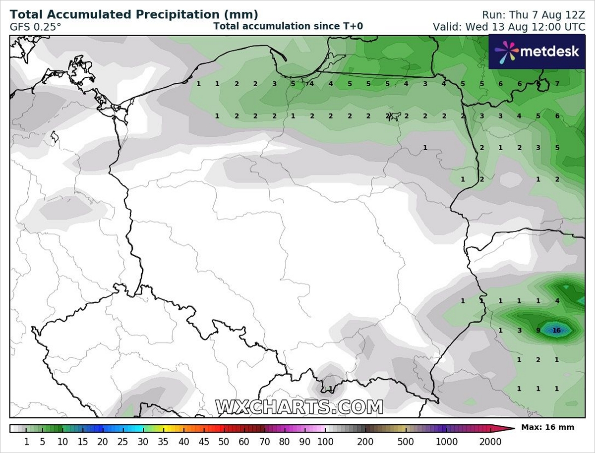 Sumy opadów (mm) prognozowane przez tydzień według modelu GFS. Fot. wxcharts.comCo ciekawe, nawet spodziewane od niedzielnego (10.08) popołudnia załamanie pogody, związane z ochłodzeniem po upale, przebiegnie przeważnie bez kropelki deszczu spadającej z chmur, a jedynie za sprawą silnego wiatru, który wymieni masę zwrotnikową na polarno-morską.