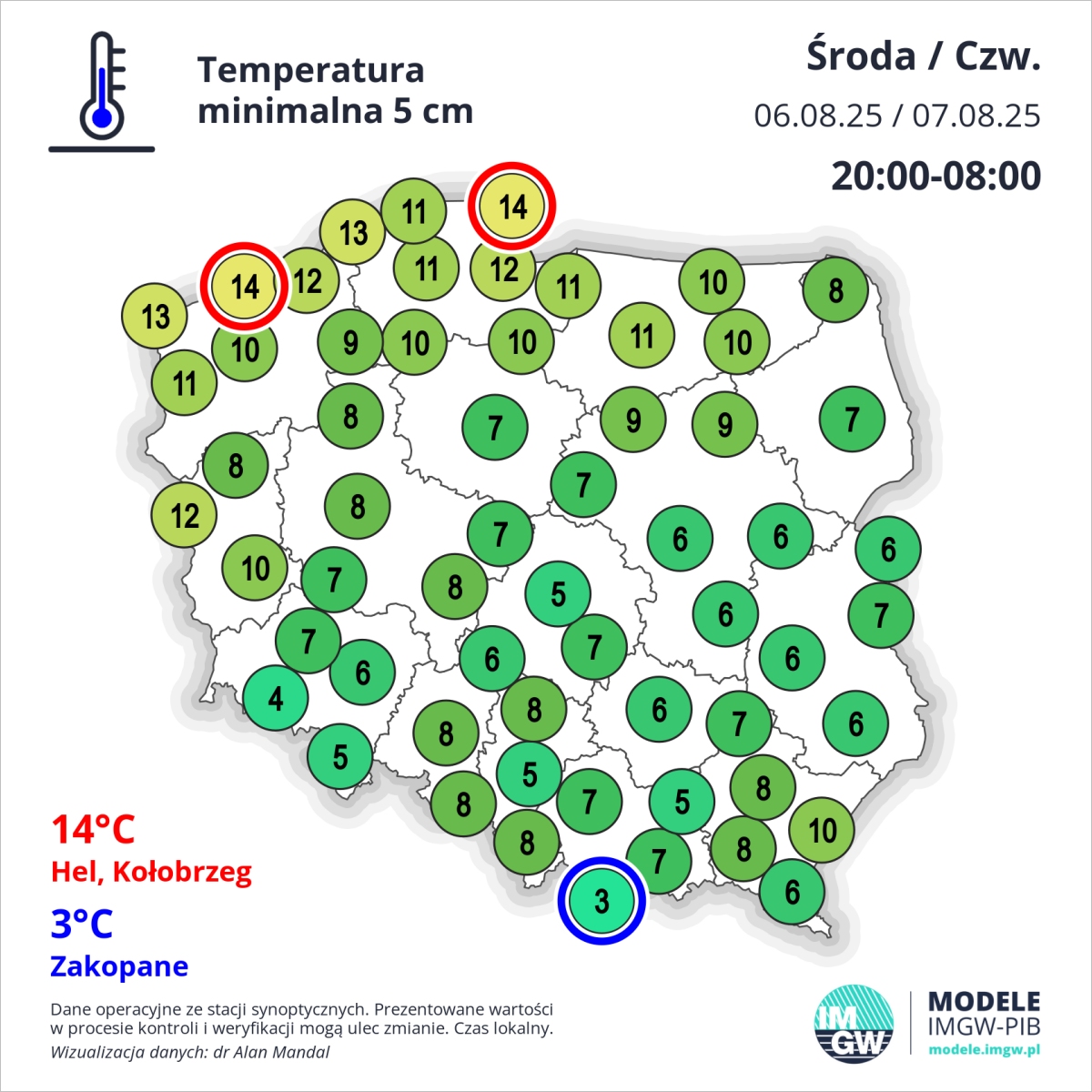 Noc ze środy na czwartek (6/7.08) okazała się wyjątkowo zimna. W bardzo rześkiej masie powietrza polarno-morskiego, napływającej nad Polskę z rejonu Islandii i południowej Grenlandii, doszło do gwałtownego promieniowania ciepła.