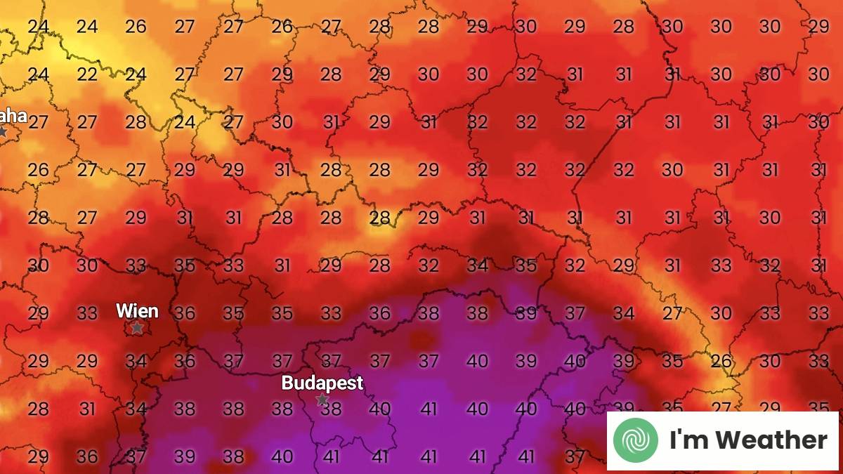 40 stopni zaledwie 60 kilometrów od polskiej granicy. Fot. imweather.comNa południu Słowacji temperatura sięgnie nawet 40 stopni w cieniu, podobnie będzie też na znacznym obszarze Węgier. Strumień rozgrzanego powietrza nie popłynie dalej na północ ku Polsce tylko dlatego, że zostanie zablokowany przez wędrujący z zachodu na wschód naszego kraju chłodny front atmosferyczny.