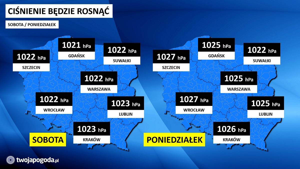 Ciśnienie rośnie, a to pierwsza oznaka tego, że pogoda zaczyna się zmieniać, po raz pierwszy od miesiąca. Znad Atlantyku przez Francję i Niemcy nad Polskę na początku przyszłego tygodnia dotrze rozbudowany wyż baryczny, który sprawi, że barometry pokażą nawet 1027 hPa.