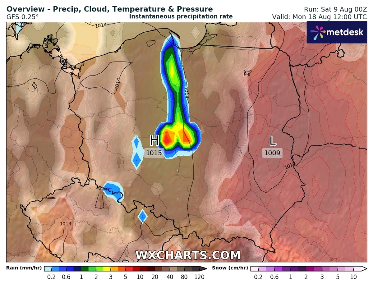W prognozie, której start datowany jest na sobotę (9.08) na godzinę 2:00 czasu polskiego, na mapie opadów dla 18 sierpnia, od Łodzi aż po Gdańsk widoczny jest charakterystyczny kształt wypełniony różnymi kolorami, oznaczającymi natężenie opadów.