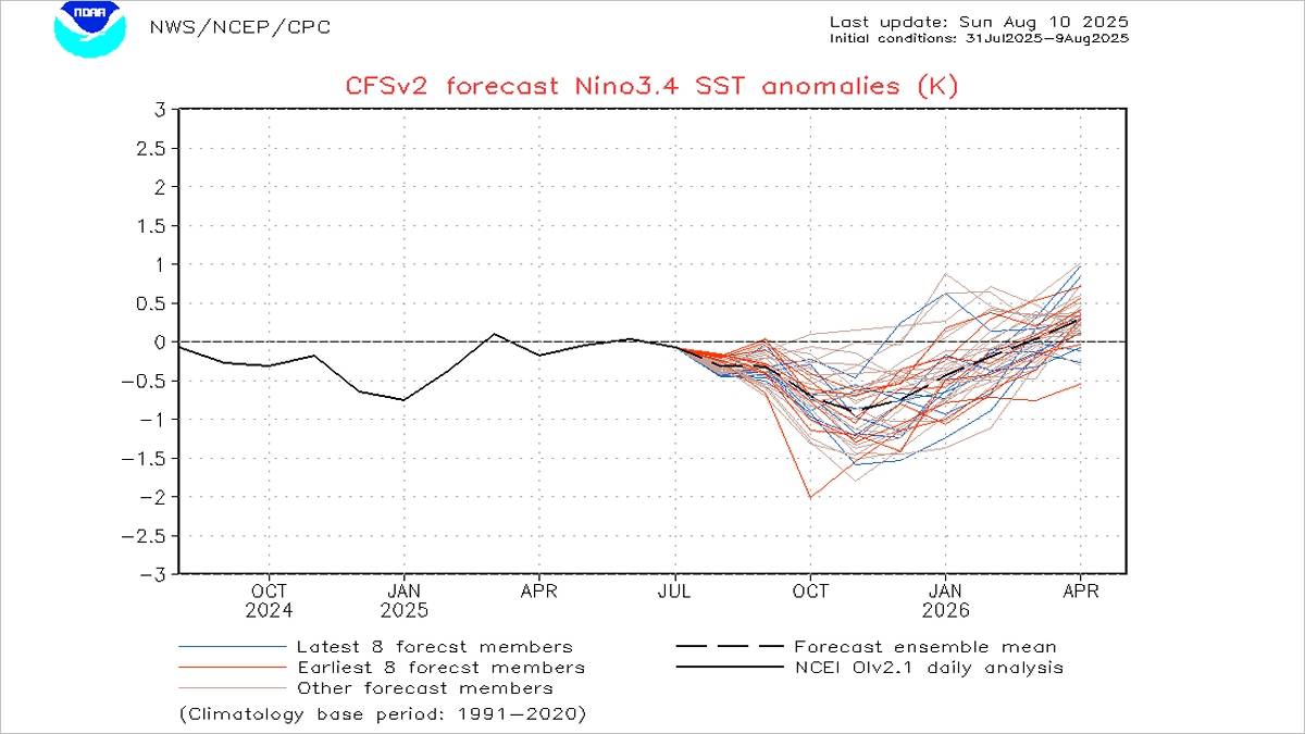 Prognoza anomalii Niño do kwietnia 2026 roku. Wykres wskazuje, że jesienią i wczesną zimą 2025/26 możliwa jest La Niña. Fot. NOAA.Pasaty wiejące między zwrotnikami przyspieszą, powodując unoszenie chłodnych wód z głębin Pacyfiku na powierzchnię. Za sprawą zimnego Prądu Peruwiańskiego w pasie od wybrzeża Ekwadoru przez Wyspy Galapagos na zachód, woda morska zacznie się wyraźnie ochładzać i będzie co najmniej o 1 stopień niższa od normy.
