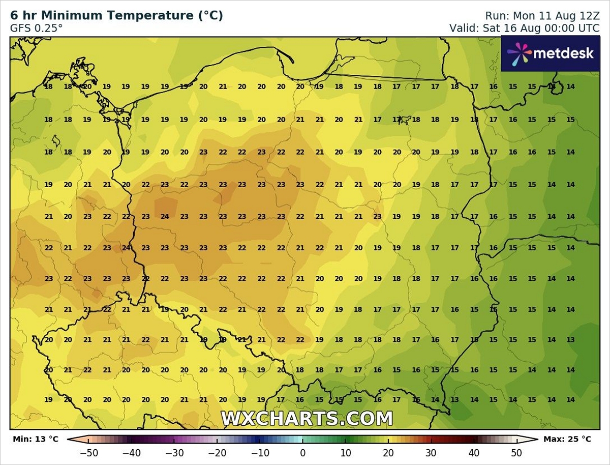 W noc z piątku na sobotę (15/16.08) 20-21 stopni spodziewamy się na zachodzie oraz częściowo na południu i w centrum. Co ciekawe aż do godziny 2:00 nad ranem trzeba się liczyć z tym, że miejscami w województwie lubuskim i wielkopolskim termometry pokazywać mogą 24-25 stopni.