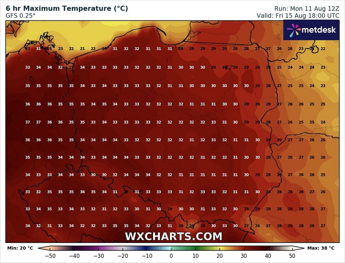 Temperatury maksymalne w piątek. Fot. wxcharts.comPiątek (15.08), a więc Święto Matki Boskiej Zielnej oraz Wojska Polskiego, przyniesie zdecydowanie najwyższe temperatury. Na ogół termometry pokażą od 30 do 33 stopni, jednak na zachodzie i południu od 33 do 35 stopni, a lokalnie w woj. dolnośląskim, lubuskim i wielkopolskim do 36-37 stopni.