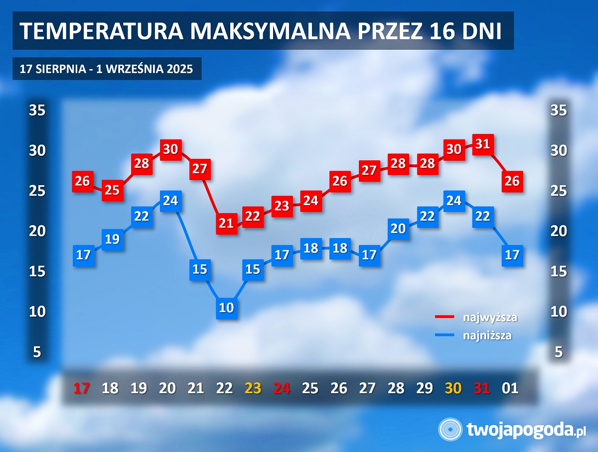 Koniec sierpnia zapowiada się gorąco, słonecznie i przeważnie sucho. Opady będą niewielkie i przelotne. Tuż przed końcem wakacji termometry znów pokażą około 30 stopni w cieniu. Wszystko wskazuje na to, że aura dostosuje się do kalendarza i 1 września upał odpuści.
