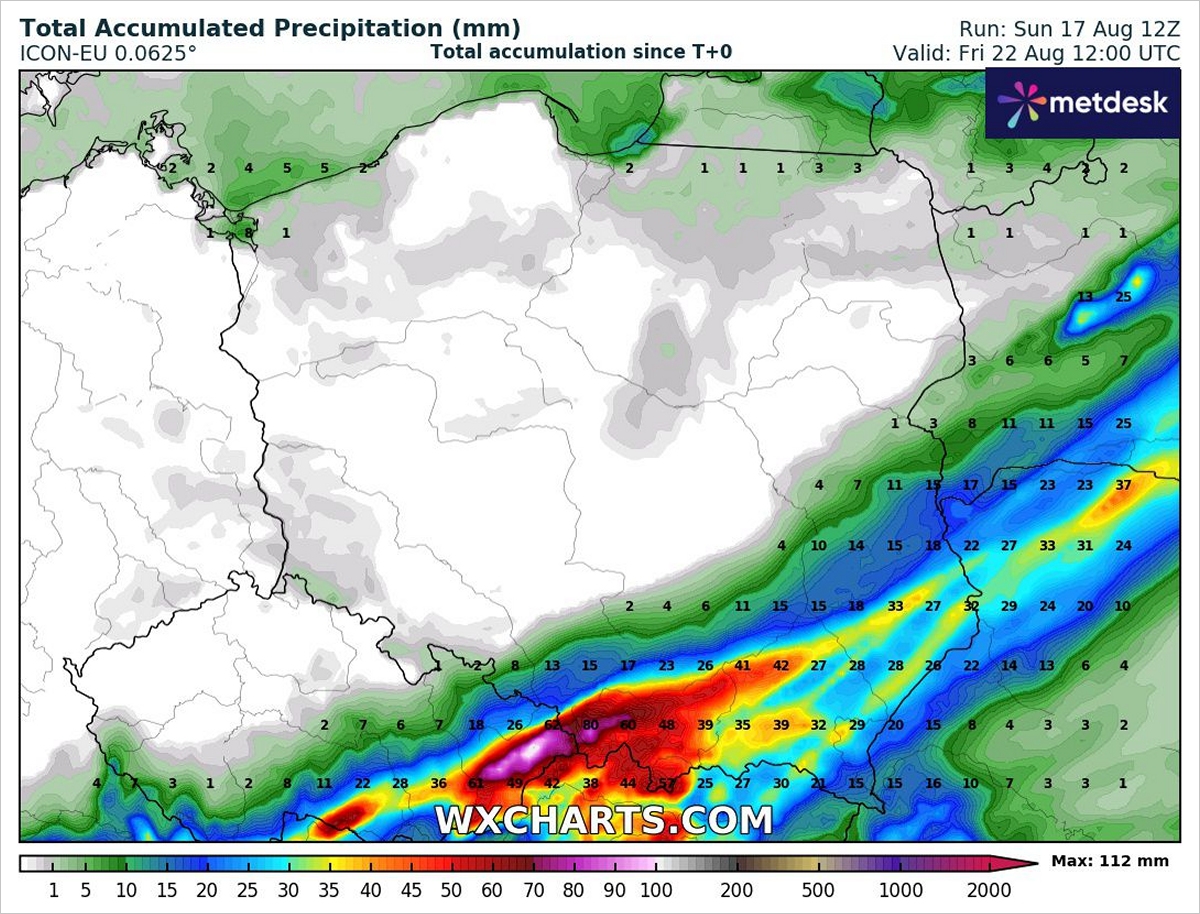 Suma opadów do piątku według modelu ICON-EU. Fot. wxcharts.comW ciągu zaledwie jednej doby miałoby z niego spaść od 20 do 50 mm deszczu, a miejscami nawet powyżej 100 mm. Tych największych ulew spodziewać się trzeba w południowej, wyżynnej i górzystej, części województwa śląskiego i małopolskiego.