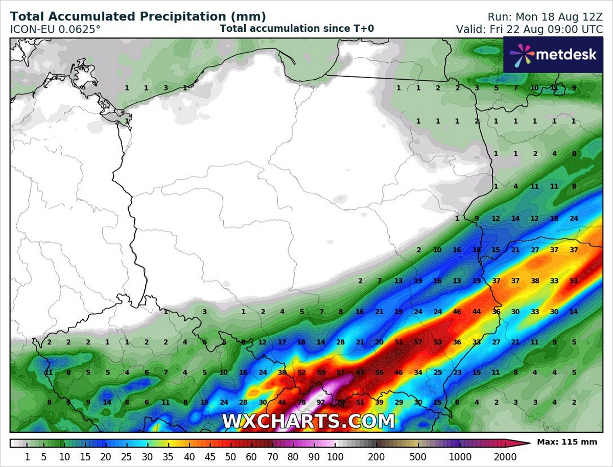 Suma opadów do piątku według modelu ICON-EU. Fot. wxcharts.comSumy opadów osiągać tam będą od 20 do 50 mm, jednak miejscami mogą przekraczać 50 mm, w szczególności na terenach górzystych Karpat. W południowej części woj. małopolskiego i śląskiego spaść może nawet powyżej 100 mm deszczu.