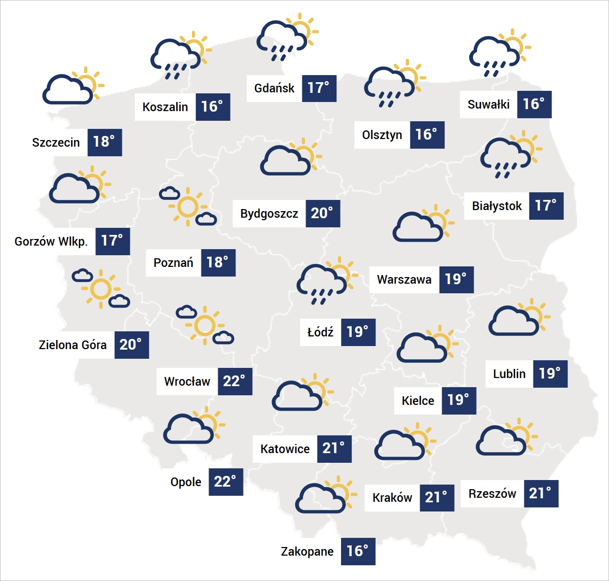 Temperatura nie będzie wysoka, w najcieplejszym momencie dnia wyniesie od zaledwie 13-15 stopni na północy i północnym wschodzie do 18-20 stopni na pozostałym obszarze. Temperatura odczuwalna z powodu zachmurzenia, wiatru i opadów będzie niższa nawet o kilka stopni.
