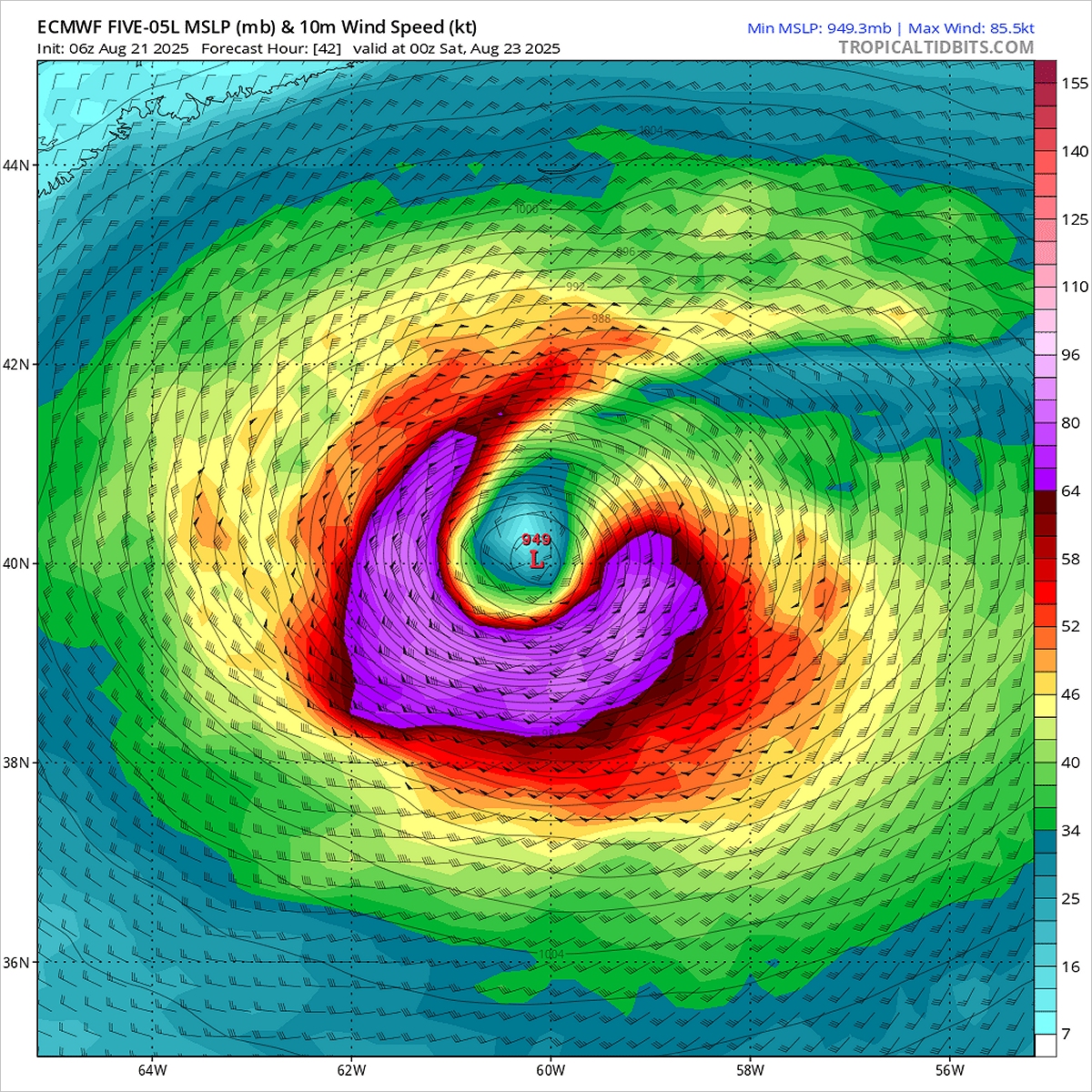Huragan Erin na mapie wiatru 23 sierpnia. Fot. tropicaltidbits.comPrzyniesie ulewne deszcze i porywiste wiatry w całej zachodniej Europie. W drugiej połowie tygodnia jego fronty zaczną wpływać na pogodę w Polsce. Musimy się liczyć z burzami, obfitymi opadami, silnym wiatrem i wahaniami temperatury.