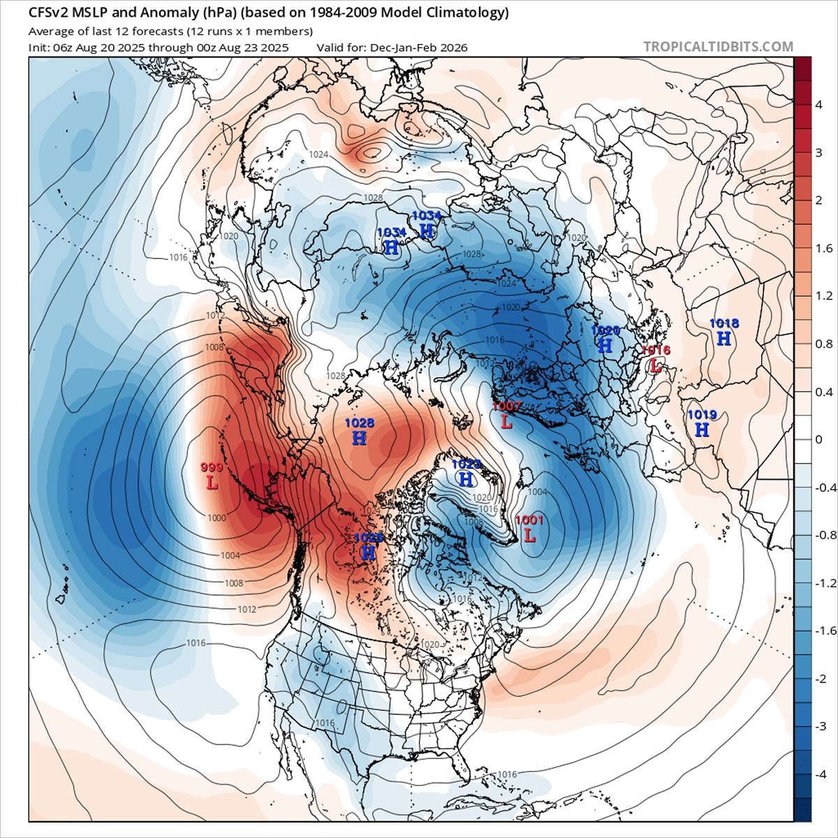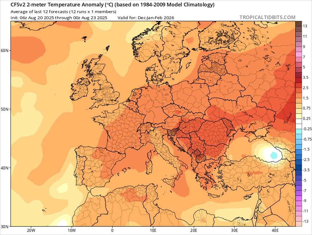Według najpopularniejszego amerykańskiego modelu prognostycznego CFS, meteorologiczna zima, która obejmuje okres od 1 grudnia do 28 lutego, będzie w Polsce łagodna. Średnie 3-miesięczne temperatury powietrza będą oscylować w okolicach 1,5 stopnia powyżej normy wieloletniej.