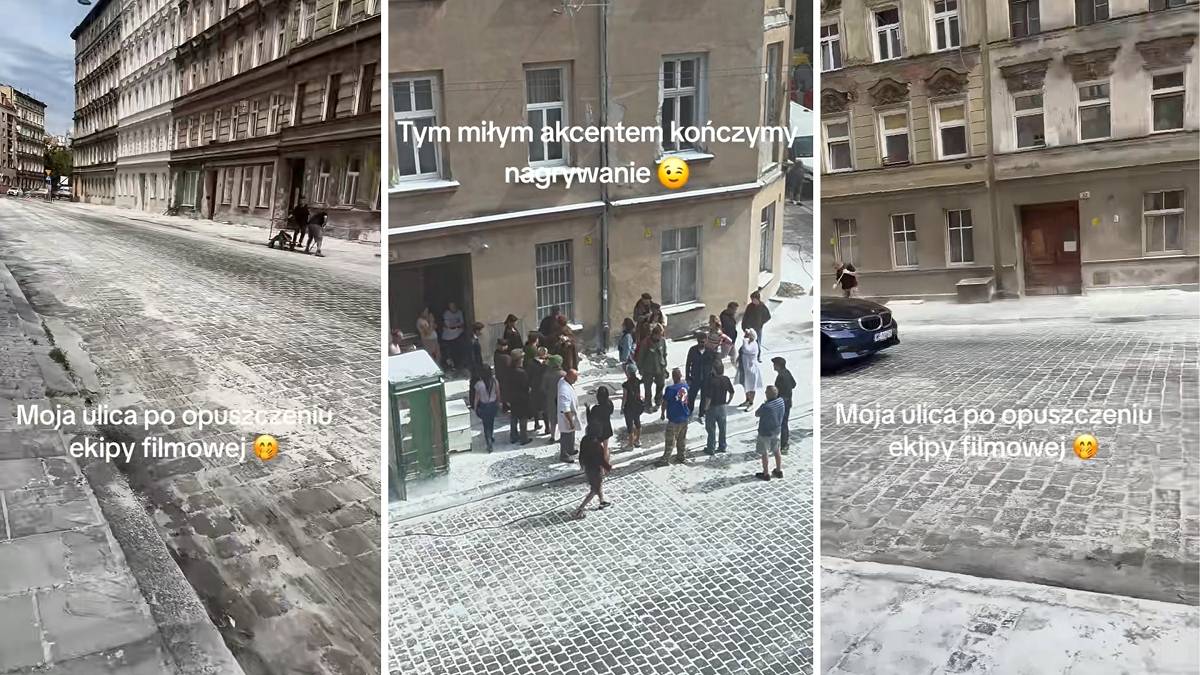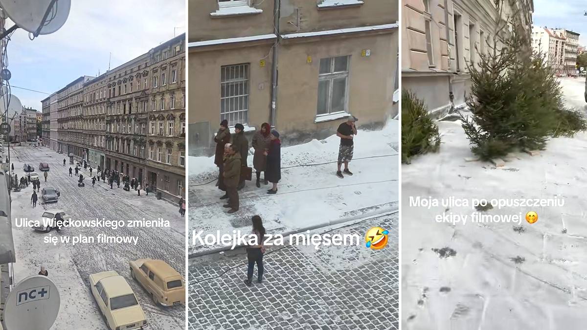 Sztuczny śnieg we Wrocławiu. Fot. TikTok / kala_1981 / debilka.by.natalia.Zadbano nie tylko o to, aby leżał śnieg, ale też, aby wszelkie elementy krajobrazu przypominały słusznie minione czasy. Pojawili się więc liczni statyści ubrani w charakterystyczne stroje sprzed ponad 40 lat, stojący w kolejce do sklepu mięsnego.