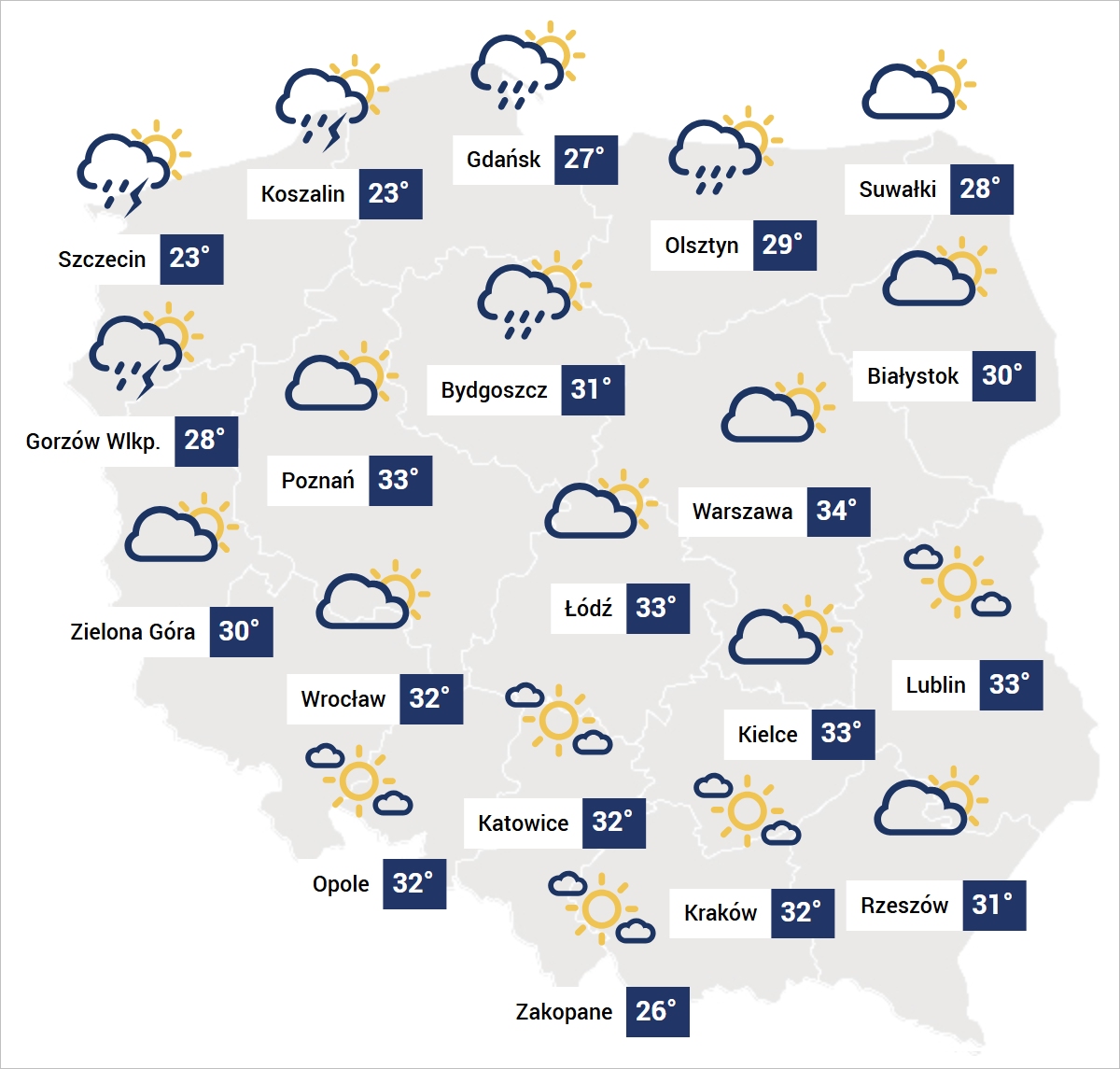 Czwartek (28.08) będzie tego najlepszym przykładem, bo spodziewamy się upału, gwałtownych burz i huraganowego wiatru halnego. Upał nie dotrze jedynie do krańców północnych. Termometry pokażą przeważnie od 30 do 33 stopni, jednak miejscami będzie nawet 35 stopni w cieniu.