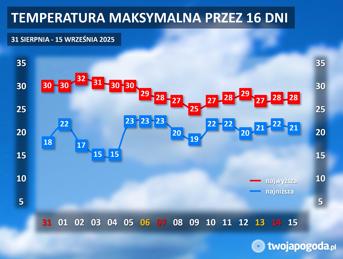Temperatury będą znacznie wyższe niż zwykle we wrześniu. Zamiast tradycyjnych 20-25 stopni, popołudniami termometry pokazywać będą od 25 do 30 stopni, jedynie podczas opadów można będzie liczyć na trochę krótkotrwałego orzeźwienia.