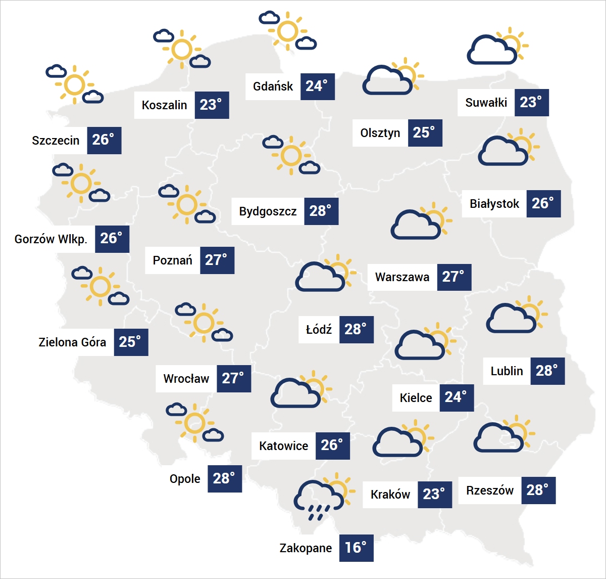 Nad wschodnią połową kraju zachmurzenie mimo to będzie spore, w przeciwieństwie do połowy zachodniej, gdzie niebo będzie niemal bezchmurne. Temperatury wreszcie się wyrównają na poziomie od 26 do 28 stopni, jedynie na północy będzie poniżej 25 stopni.
