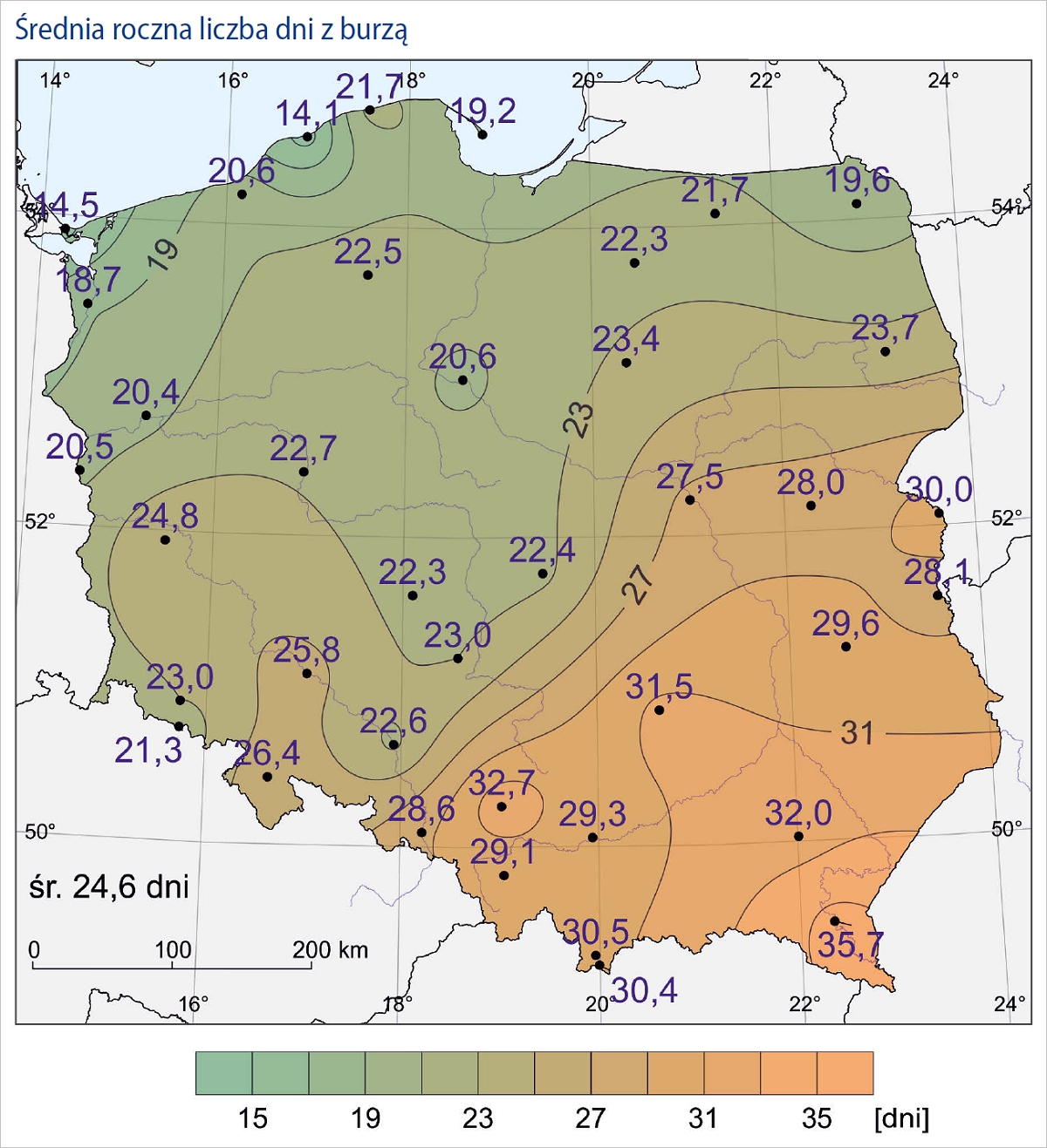 Średnia roczna liczba dni z burzą. Fot. Atlas Klimatu Polski (1991-2020).Bliskość Beskidów wpływa na lokalną cyrkulację powietrza, kierując wilgotne masy w stronę Wyżyny Śląskiej, a urozmaicona rzeźba terenu wzmaga procesy konwekcyjne, które inicjują burze. W przeciwieństwie do bardziej płaskich regionów, brak naturalnych barier terenowych umożliwia swobodny napływ mas powietrza sprzyjających burzom.