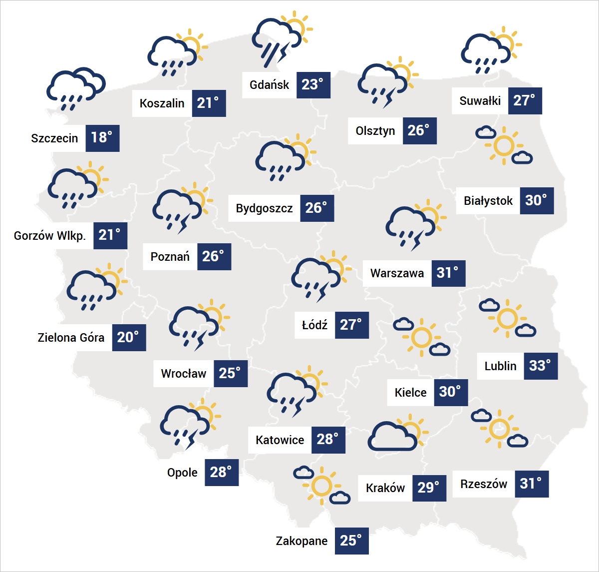 Od wtorku (2.09) pogoda skomplikuje się. Od wschodu będzie nacierać fala upałów, a od zachodu front burzowy. Przez większą część tygodnia upał będzie się utrzymywać nad wschodnimi województwami, w drugiej połowie tygodnia rozlewają się na południowe i centralne regiony.