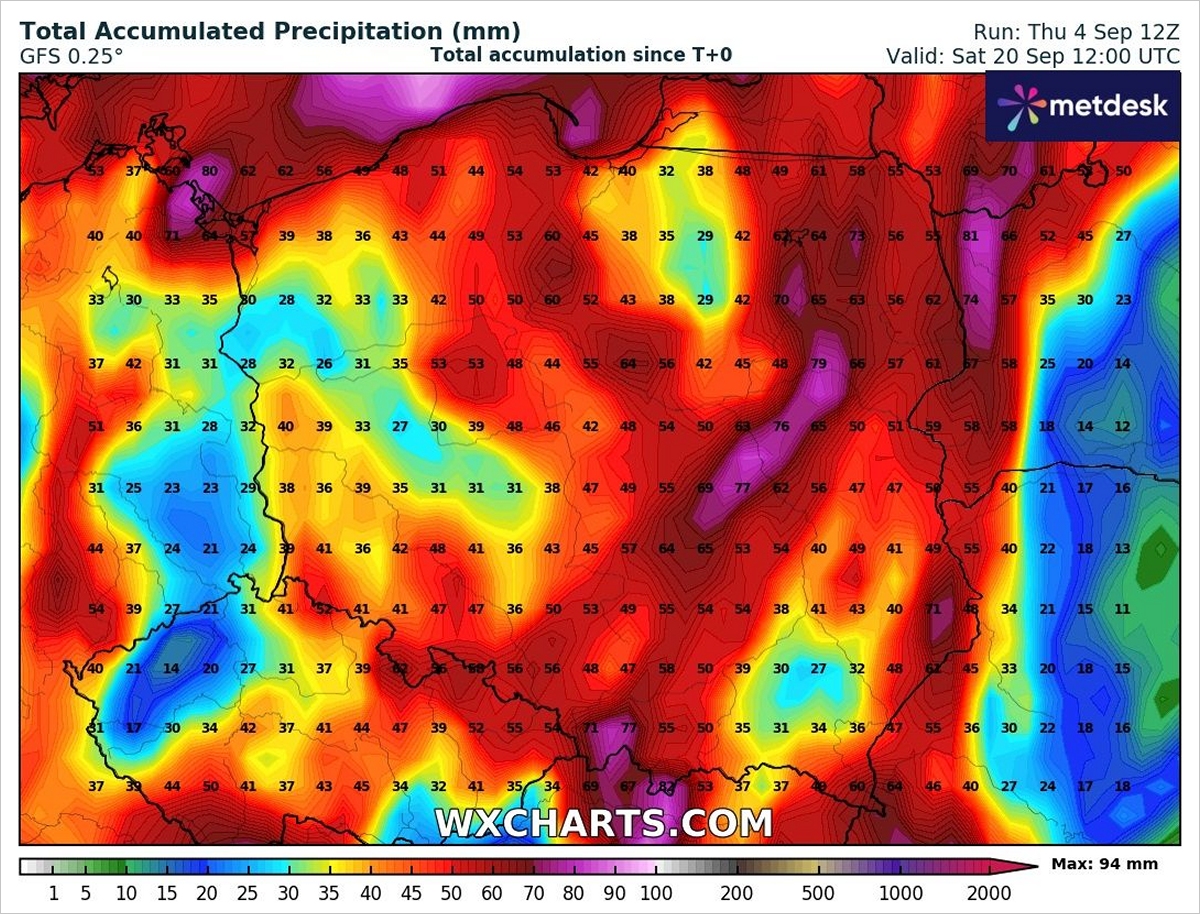 Sumy opadów (mm) prognozowane do 20 września według modelu GFS. Fot. wxcharts.comPod koniec tygodnia padać będzie przeważnie przelotnie, ponieważ deszcze będą połączone z burzami. Mogą być więc intensywne, jednak tylko lokalnie. Nie zdołają więc nawodnić gleby na tyle, aby grzybnia miała idealne warunki do rozwoju.