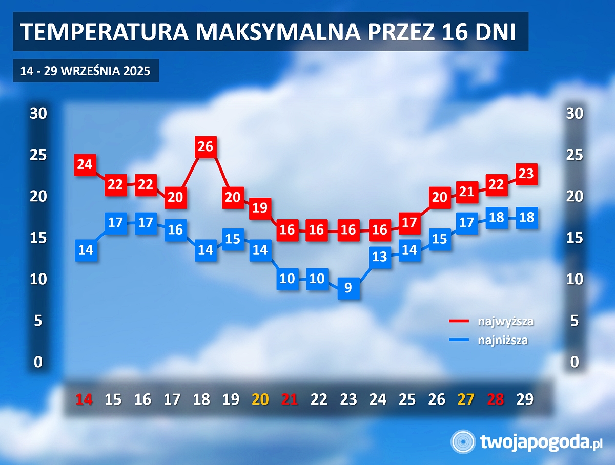 Temperatury będą się mocno wahać. Podczas opadów termometry pokazywać będą jedynie około 15 stopni, jednak przy dłuższych chwilach ze słońcem będzie się ogrzewać nawet powyżej 20 stopni. Szczególnie ciepło zapowiada się 18 września, kiedy halny przywieje aż 26 stopni.