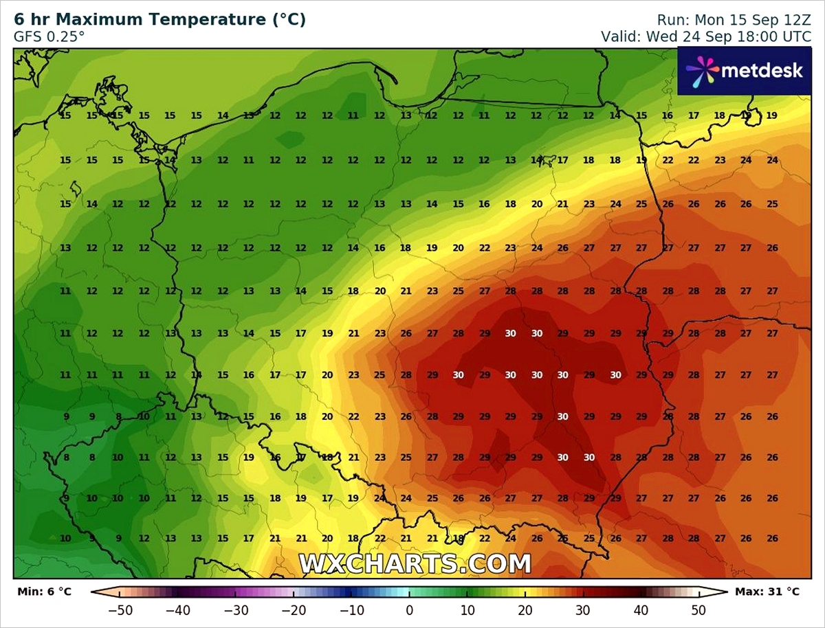 Prognozy nie są jeszcze w pełni zgodne, co do tego, kiedy gorące powietrze ostatecznie opuści nasz kraj. Według większości z nich dojdzie do dużego podziału termicznego. Przynajmniej do 24 września na zachodzie i północy będzie bardzo deszczowo i zaledwie 10-15 stopni, a na wschodzie i południu słonecznie, sucho i gorąco, nawet do 25-30 stopni.