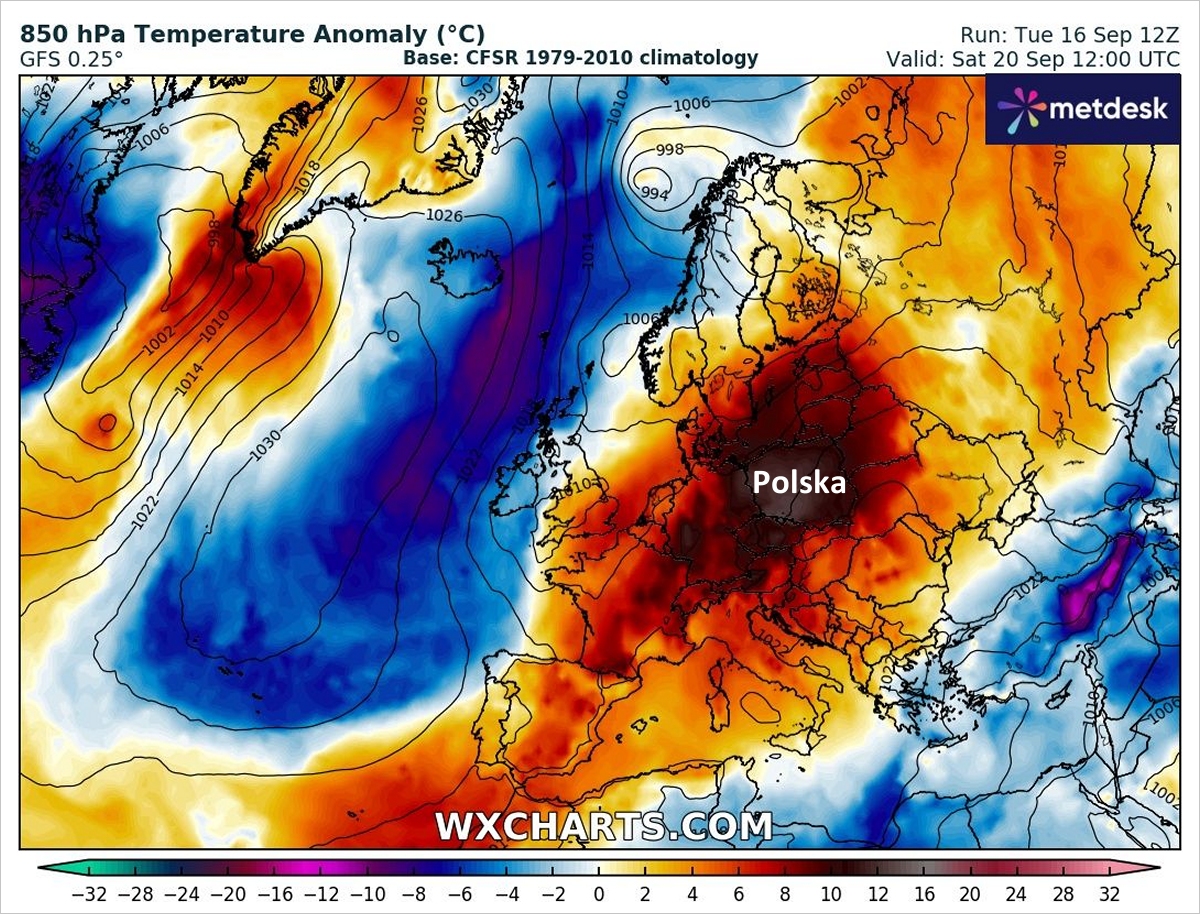Anomalie temperatury na wysokości 850 hPa w sobotę oznaczają, że będzie gorąco. Fot. wxcharts.comTo będzie jedna z najpóźniejszych fal gorąca w całej serii pomiarowej. Wykorzystajmy ją na aktywność na świeżym powietrzu, ponieważ krótko po jesiennym upale nadejdą wyjątkowe, arktyczne chłody, połączone z nocnymi i porannymi przymrozkami.