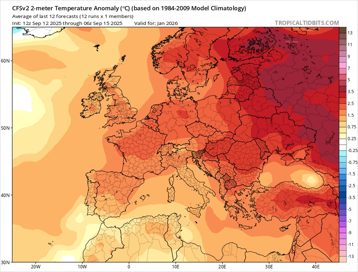 Czerwony kolor oznacza, że styczeń będzie bardzo ciepły. Fot. tropicaltidbits.comGrudzień obarczony jest największym ryzykiem zimowej pogody, ponieważ średnia miesięczna temperatura może oscylować w okolicach normy, a jeśli powyżej niej, to nieznacznie. To też oznacza, że częściej może sypać śnieg zamiast deszczu.