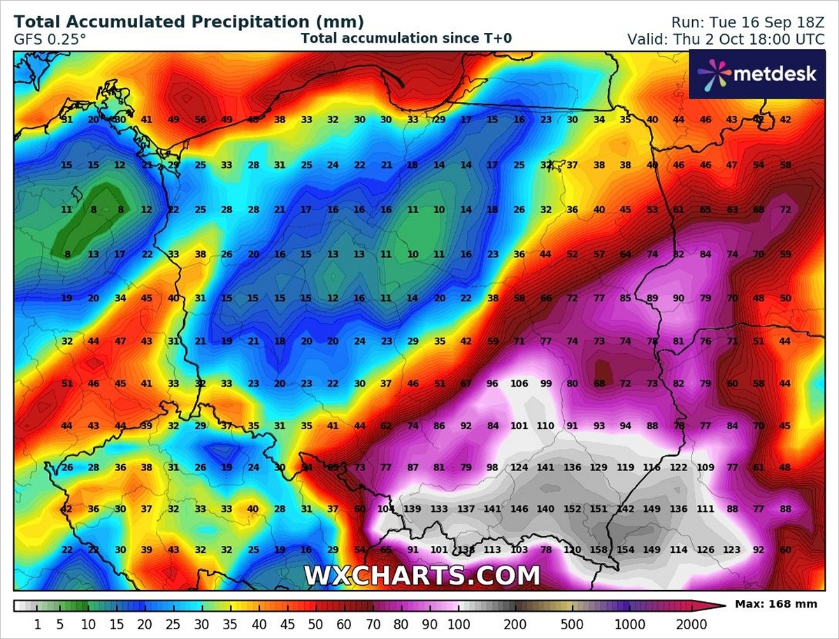 Sumy opadów (mm) prognozowane do 2 października według modelu GFS. Fot. wxcharts.comW przeciwnym razie w kilka dni potrafią przynieść tyle deszczu, ile normalnie powinno spaść przez miesiąc, a nawet dwa. Zgodnie z prognozami taki układ niżowy miałby do nas dotrzeć około wtorku (23.09) i przynosić ciągłe, obfite deszcze przez 2-3 dni.