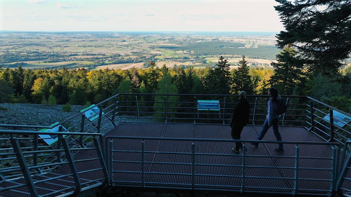 Platforma widokowa na szczycie Łysej Góry w Górach Świętokrzyskich. Fot. Polsat Box Go.Wędrówka kończy się w Karczmie w Kakoninie, idealnym miejscu, by odpocząć i spróbować lokalnych przysmaków po spotkaniu z dziką naturą i magią świętokrzyskich legend.
