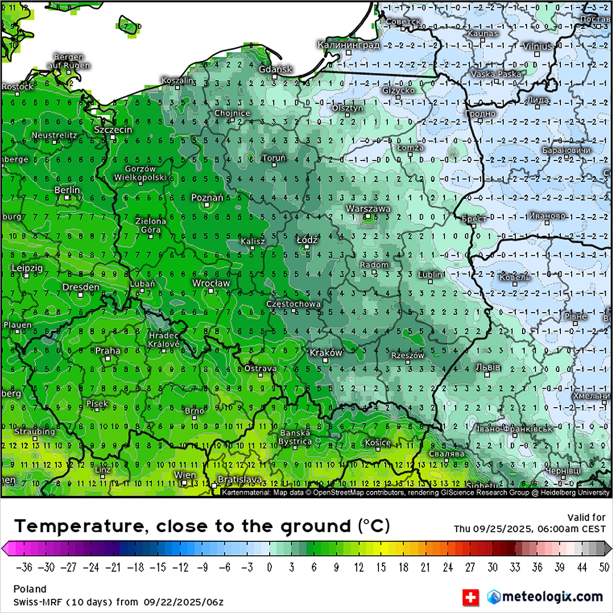 Temperatury przy gruncie prognozowane na czwartkowy poranek. Fot. meteologix.comPrzy gruncie ujemne temperatury będą powszechne, zwłaszcza w dzielnicach północnych, wschodnich, centralnych oraz na terenach górzystych. Spodziewamy się nawet do minus 5 stopni, głównie na tzw. mrozowiskach.