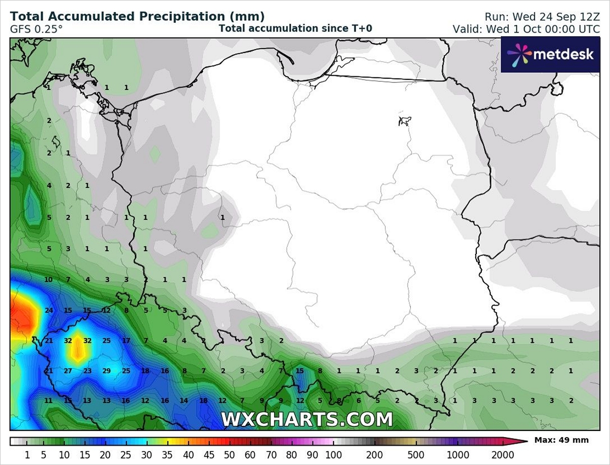 Sumy opadów (mm) prognozowane do końca miesiąca według modelu GFS. Fot. wxcharts.comBędą one zapewniać słoneczną i bardzo suchą aurę. Jeśli pojawią się deszcze, to jedynie lokalnie i będą bardzo słabe. W czwartek i piątek (25-26.09) przelotnie popada tylko na krańcach południowych, głównie w górach. Z kolei w przyszły wtorek (30.09) pokropić może na krańcach zachodnich.