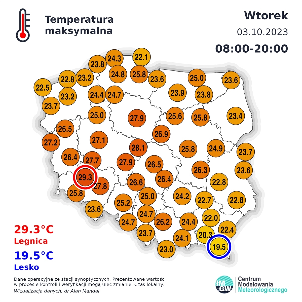 Tak gorąco było 3 października 2023 roku. Fot. IMGW-PIB.W większości regionów kraju temperatura maksymalna przekroczyła 25 stopni. W Toruniu i we Wrocławiu zmierzono 28 stopni, a w Poznaniu, Bydgoszczy, Gorzowie i Łodzi było 27 stopni w cieniu. Pobity został tego dnia poprzedni rekord ciepła babiego lata z 4 października 1966 roku.