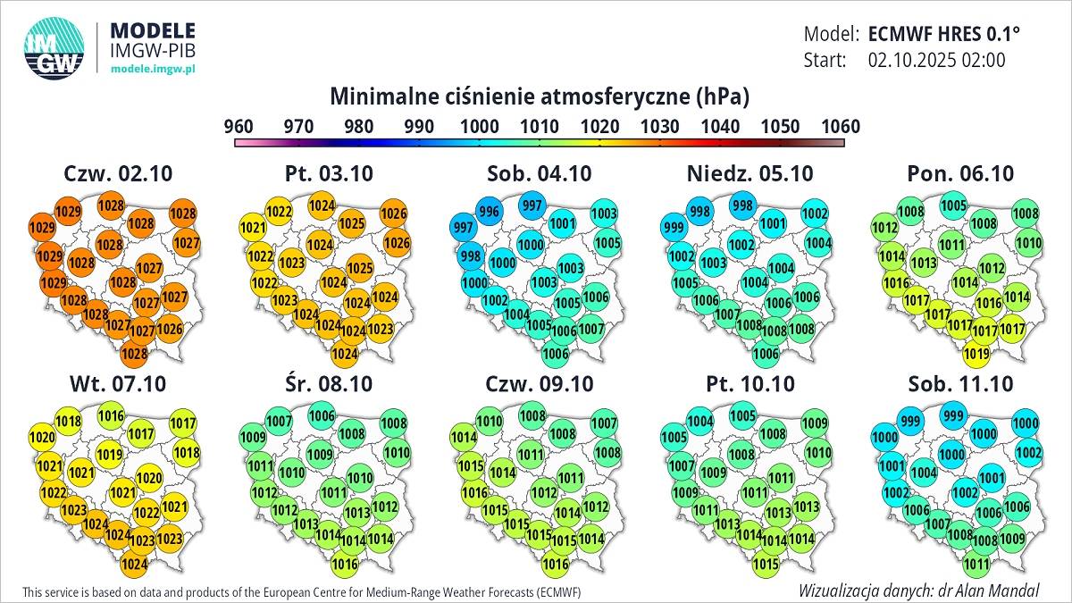 Minimalne ciśnienie atmosferyczne na tle dni. Fot. IMGW-PIB.Wtedy na zachodzie i północy kraju barometry pokażą zaledwie od 995 do 1000 hPa, a to oznacza, że w zaledwie 2 dni ciśnienie spadnie nawet o 35-40 hPa. W województwach południowych i wschodnich spadek będzie mniejszy, ale mimo to przekroczy 20-25 hPa, a na północnym wschodzie 25-30 hPa.