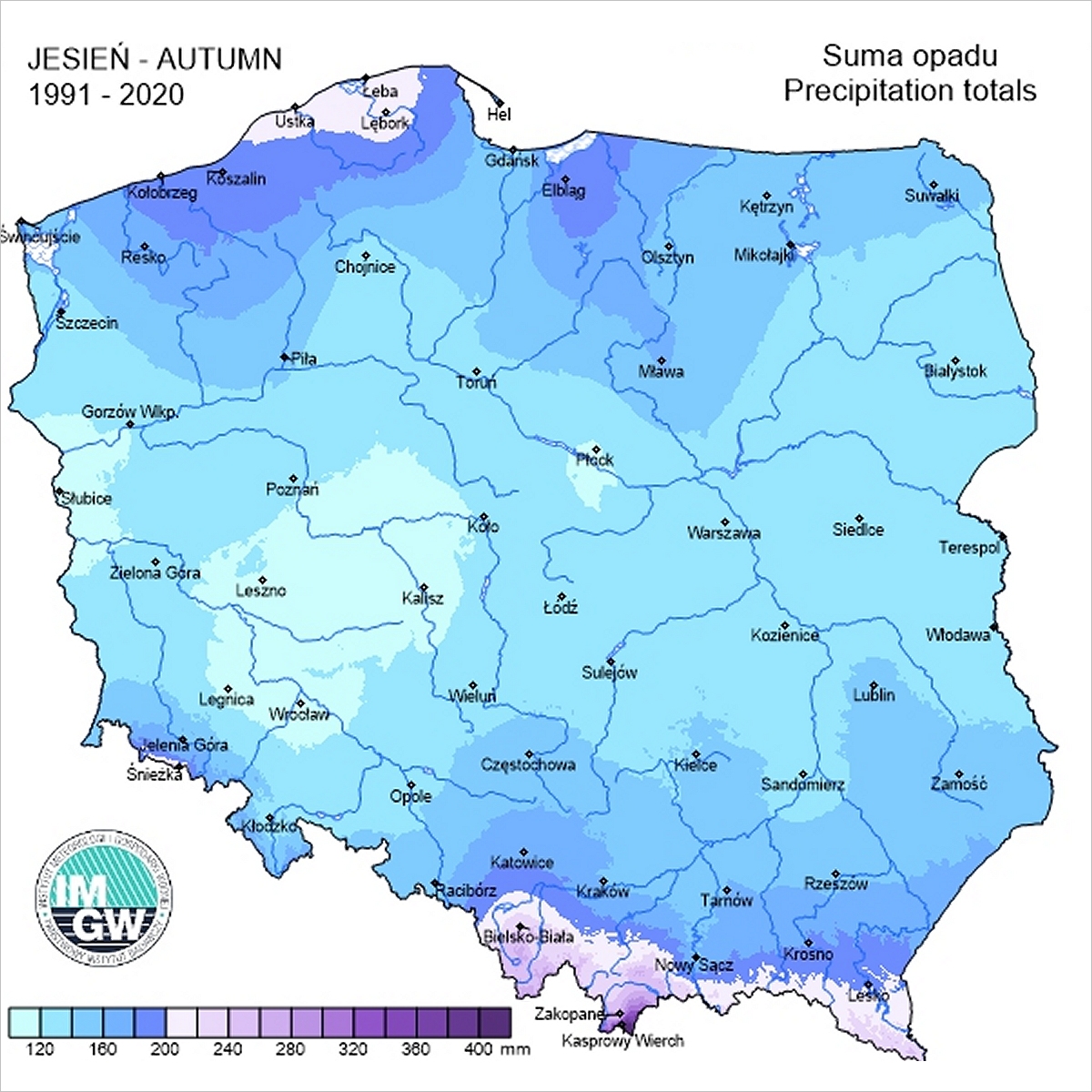 Średnie sumy opadów (mm) jesienią w latach 1991-2020. Fot. IMGW-PIB.Liczba dni z opadem prezentuje się inaczej: zima prowadzi z 15-20 dniami deszczowymi na kwartał, jesień i lato dzielą drugie miejsce (12-15 dni), a wiosna zamyka stawkę (10-12 dni). Te dysproporcje wyjaśniają, dlaczego lato "zalewa" nas wodą w krótkim czasie, a jesień "moknie" dłużej i bardziej równomiernie.