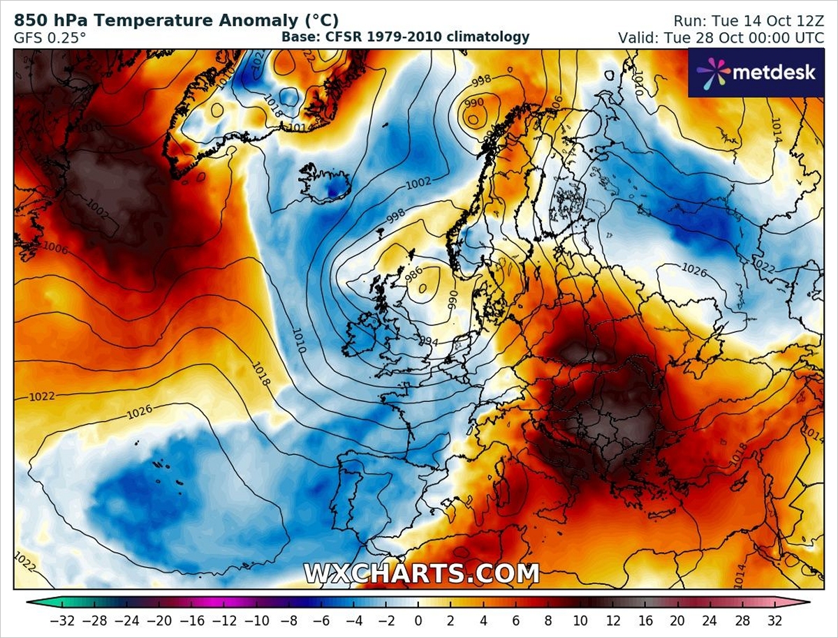 Anomalie temperatury powietrza w Europie (850 hPa) w dniu 28 października. Fot. wxcharts.comBędzie też więcej rozpogodzeń i mniej opadów, co również sprawi, że najbardziej barwny okres jesieni minie pod znakiem przyjemnej pogody, która wybawi nas od chandry i zasili pozytywną energią na dalsze tygodnie i miesiące.