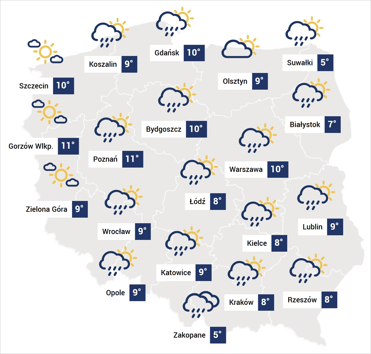 Temperatura będzie niska, od 5 stopni na północnym wschodzie przez 8-10 stopni na większym obszarze do nawet 11-12 stopni na zachodzie. Ustępowanie układu niżowego oznacza zdecydowaną poprawę pogody, która od niedzieli (19.10) przyniesie nam mnóstwo słońca i coraz cieplejsze powietrze.