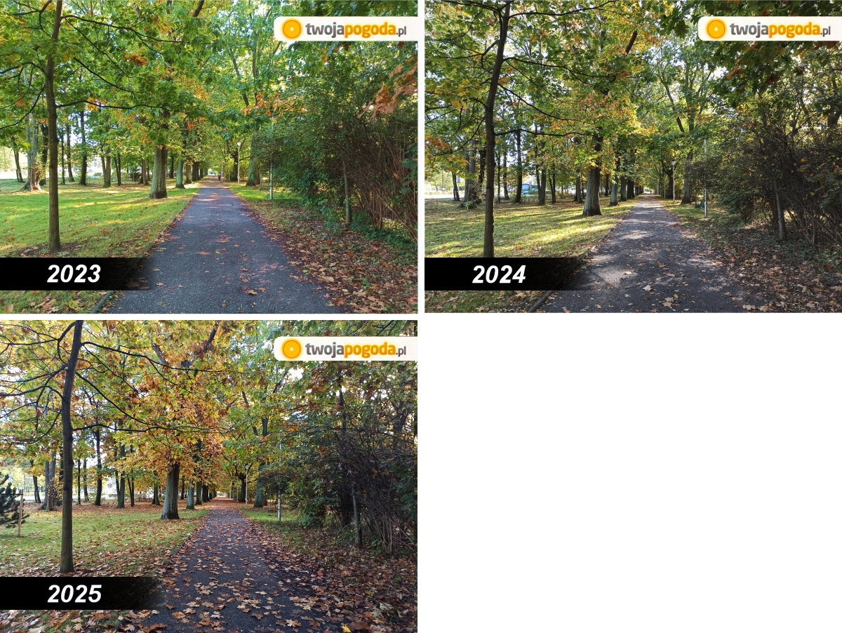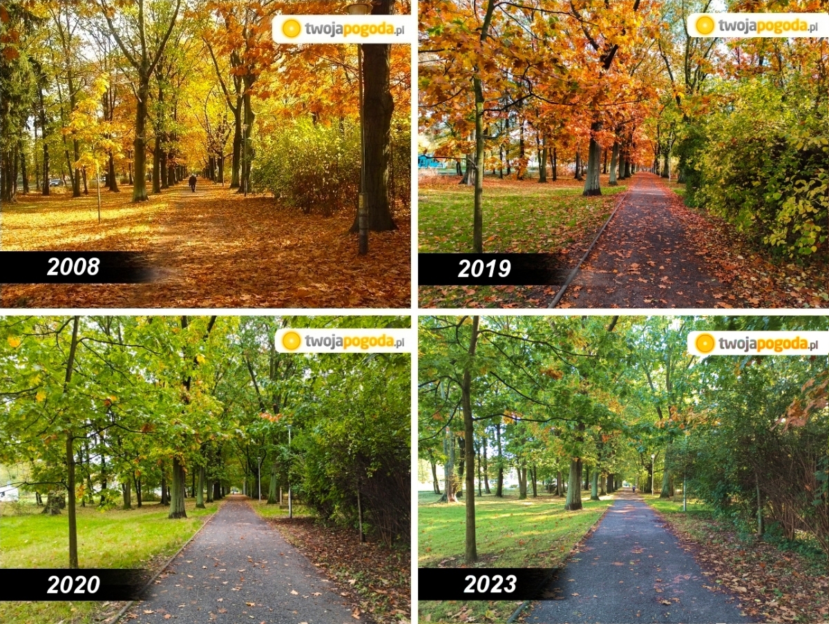Porównanie skrajnych barw jesieni 18 października w latach 2008, 2019, 2020 i 2023. Fot. TwojaPogoda.plTo, jaką barwę mają liście i jak szybko opadają na ziemię, zależy od kąta padania promieni słonecznych, utraty ciepła i zasobów składników mineralnych. Chlorofil zawarty dotąd w liściach zaczyna ulegać rozpadowi, przez co drzewa zaczynają wytwarzać antocyjany.