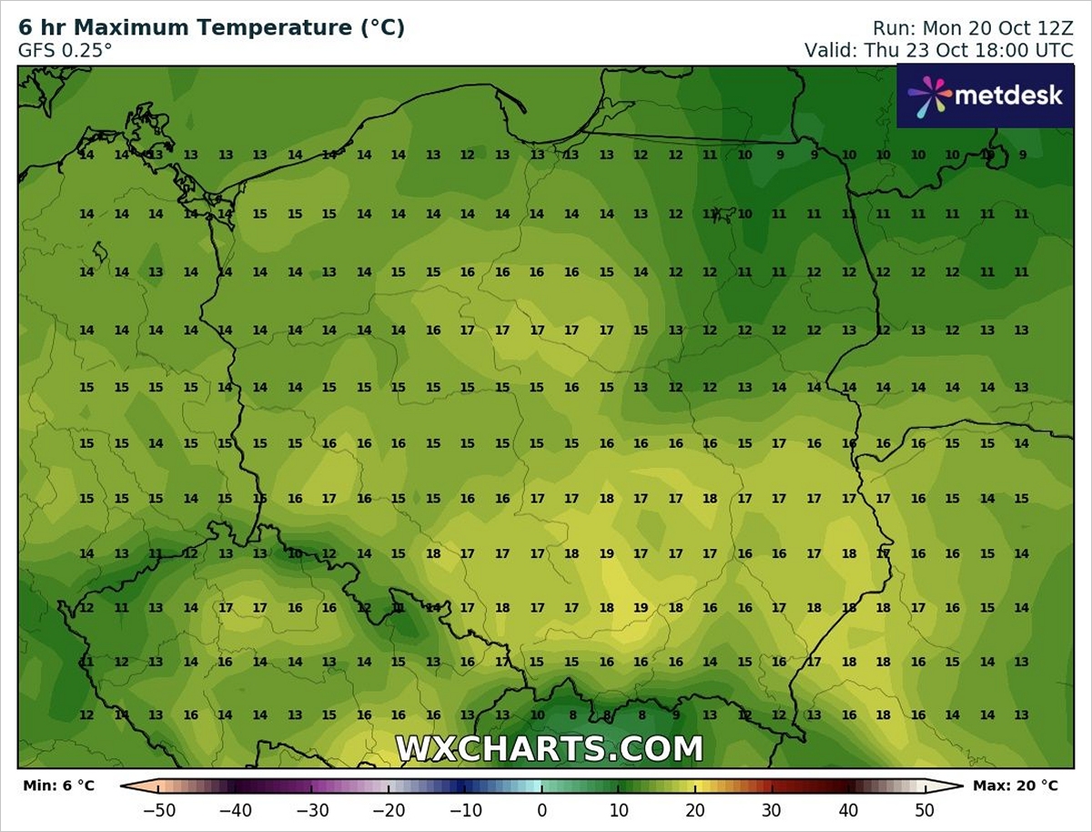 Jedynym przyjemnym akcentem w tej jesiennej zawierusze będzie temperatura, która w godzinach popołudniowych w większości regionów przekroczy 15 stopni, a miejscami na południu, południowym wschodzie i w centrum sięgnie 20 stopni. W Małopolsce, za sprawą wiatru halnego, możliwe są 22-23 stopnie.