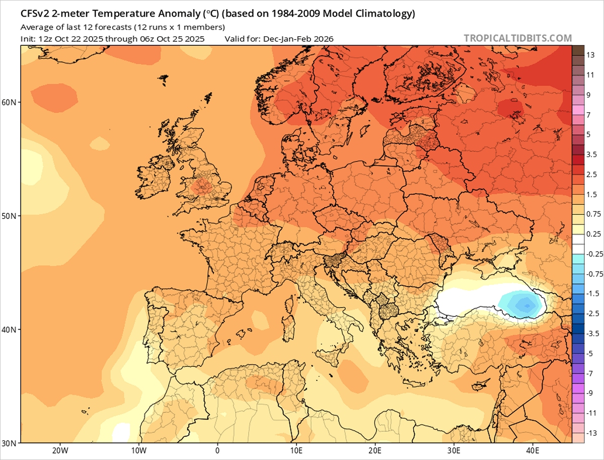 Według najpopularniejszego amerykańskiego modelu prognostycznego CFS, meteorologiczna zima, która obejmuje okres od 1 grudnia do 28 lutego, będzie w Polsce łagodna. Średnie 3-miesięczne temperatury powietrza będą oscylować od 1,5 do 2 stopni powyżej normy wieloletniej.