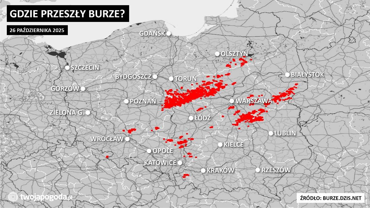 Błyskawice i donośne grzmoty zaskoczyły mieszkańców wschodnich, centralnych i południowych województw. Najliczniejsze wyładowania odnotowano w szerokim pasie od Konina w Wielkopolsce po Ciechanów na Mazowszu, a także w rejonie Garwolina na Mazowszu.