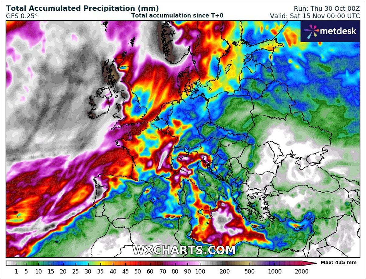 Sumy opadów (mm) w pierwszej połowie listopada w Europie. Fot. wxcharts.comKraje takie jak Irlandia, Wielka Brytania, Francja, Niemcy, Hiszpania i Portugalia oraz Skandynawia mogą spodziewać się powyżej średnich opadów, z możliwością lokalnych powodzi i silnych wiatrów. Prognozy wskazują na utrzymujący się południowo-zachodni przepływ, który blokuje chłodniejsze masy powietrza z północy, utrzymując temperatury na poziomie łagodnym, ale z dominacją wilgotnej, niestabilnej aury.
