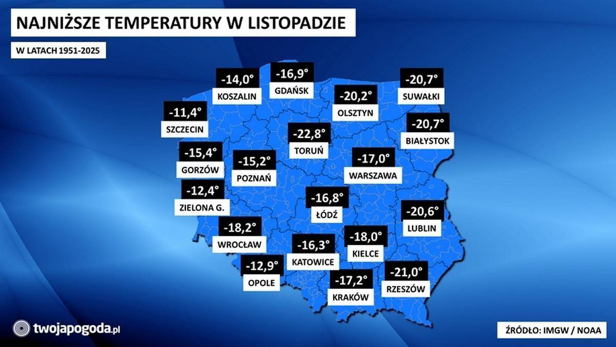 Według danych IMGW-PIB, w Poznaniu największy listopadowy mróz po 1951 roku wynosił minus 15 stopni, w Katowicach minus 16 stopni, w Krakowie, Łodzi i Warszawie minus 17 stopni, we Wrocławiu i Kielcach minus 18 stopni, w Białymstoku, Lublinie i Rzeszowie minus 21 stopni, a w Toruniu minus 23 stopnie.