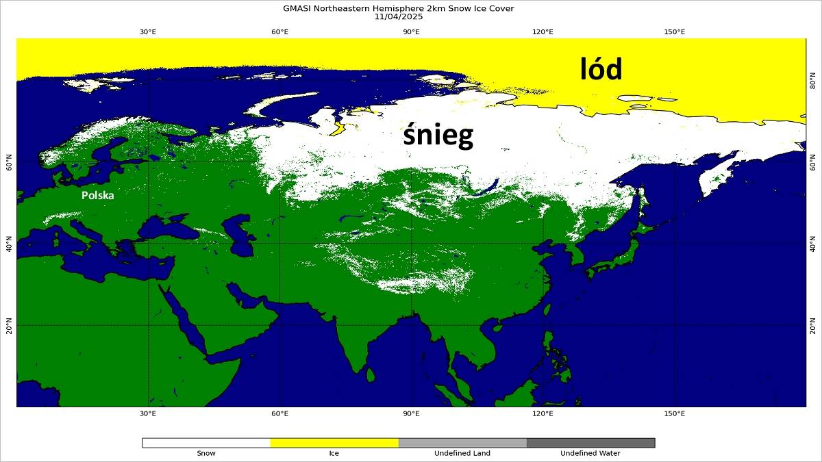 Aktualny zasięg pokrywy śnieżnej i lodowej. Fot. NOAA.Na szczęście dalej w głąb Europy wędrować już nie będzie, bo przyblokowana zostanie przez ciepłe masy napływające nad nasz kontynent z południa. Jeśli Polski sięgnie czoło tej fali, to jednak skończy się na niewielkich mrozach, głównie nocnych i porannych.
