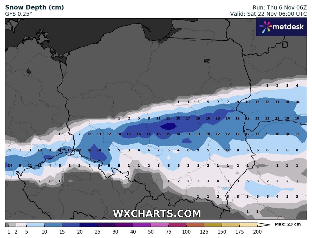 W 1-2 dni miałoby spaść od 1 do 10 centymetrów śniegu, jednak w pasie od Dolnego Śląska przez Ziemię Łódzką po Mazowsze nawet do 25 centymetrów. Na szczęście jest to skrajna wiązka prognozy, a więc najmniej prawdopodobna, chociaż nie całkiem niemożliwa.