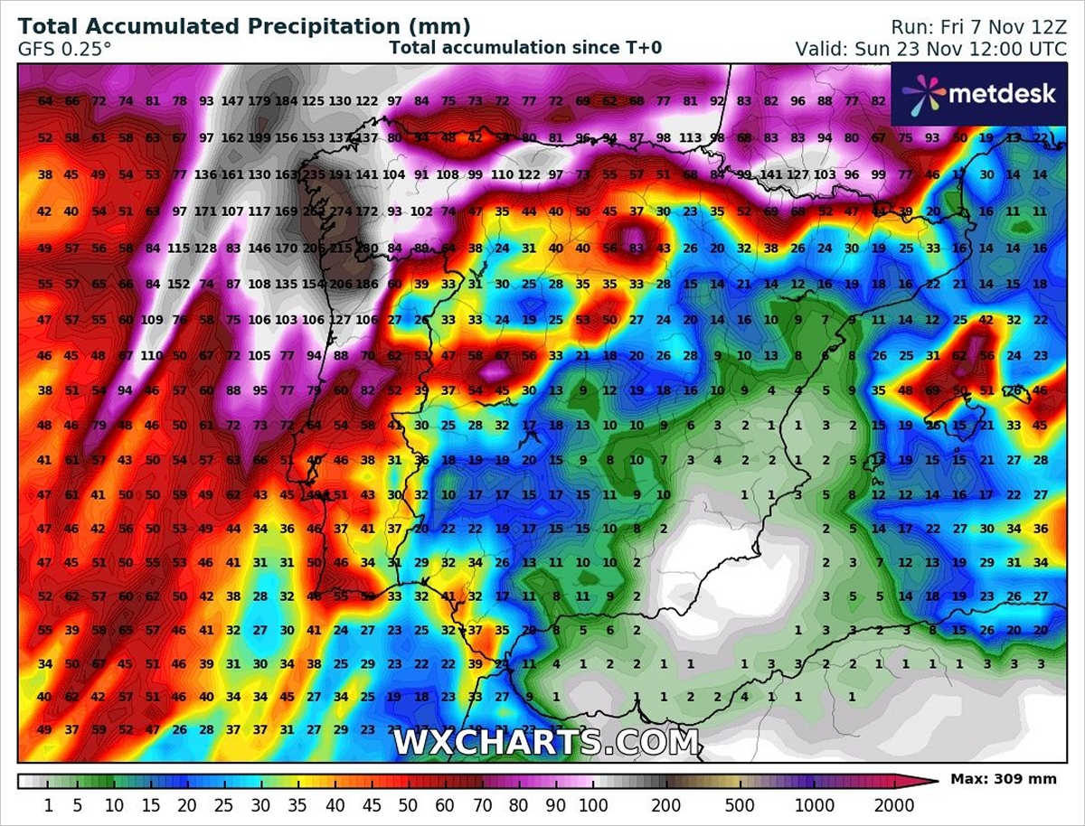 Sumy opadów (mm) na Półwyspie iberyjskim prognozowane do 23 listopada. Fot. wxcharts.comSzczególnie trudna sytuacja panuje od kilku dni w Portugalii, zachodniej i północno-wschodniej Hiszpanii oraz w południowej Francji. Spadło tam już ponad 100 litrów deszczu na metr kwadratowy ziemi.