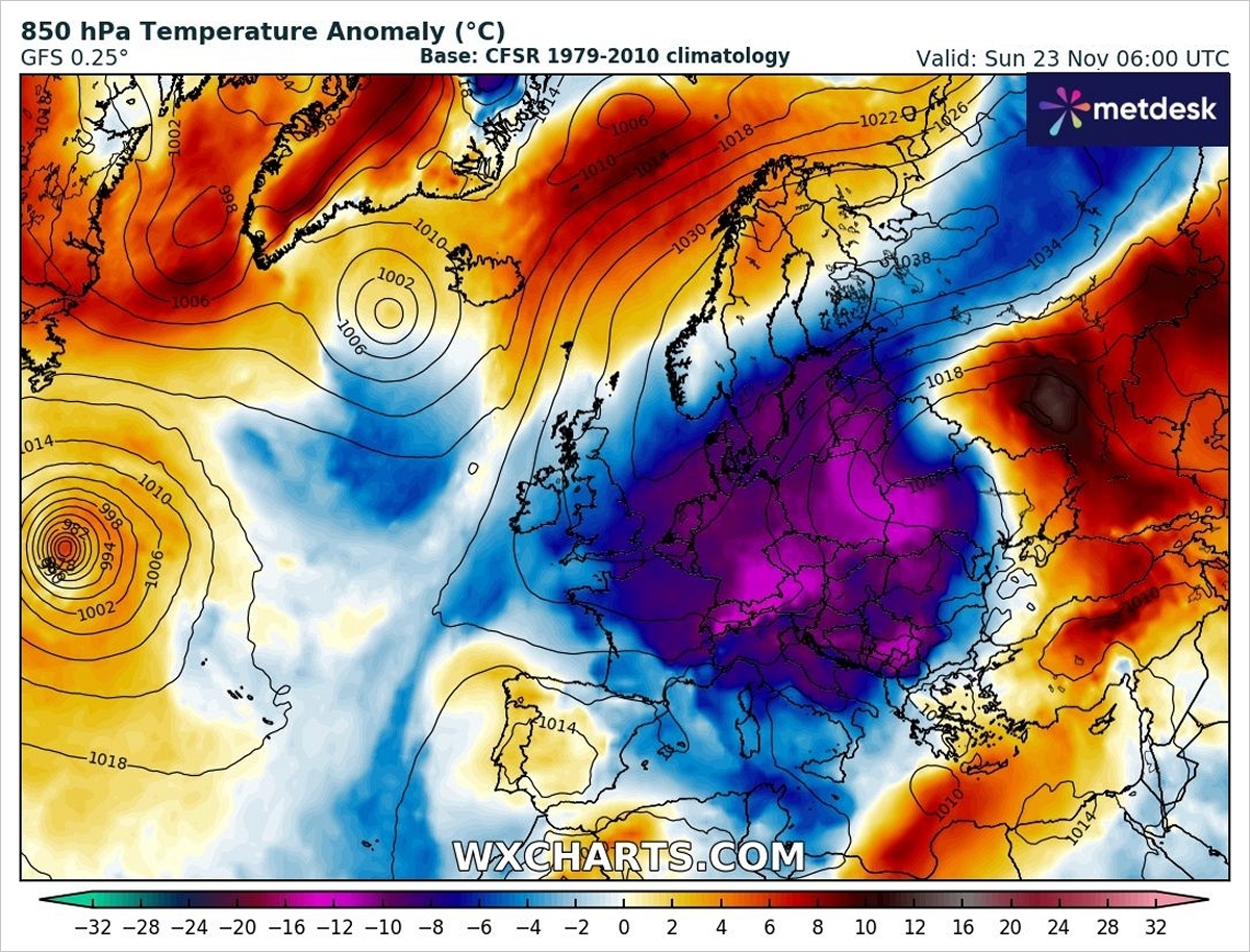 Anomalie temperatury powietrza na wysokości 850 hPa w ostatniej dekadzie listopada. Fot. wxcharts.comTemperatury nocami i o porankach poniżej zera, a w najcieplejszym momencie dnia blisko zera, oznaczają też, że deszcz zacznie przechodzić w deszcz ze śniegiem, a miejscami także w sam śnieg. W niektórych regionach naszego kraju krajobrazy mogą się zabielić.